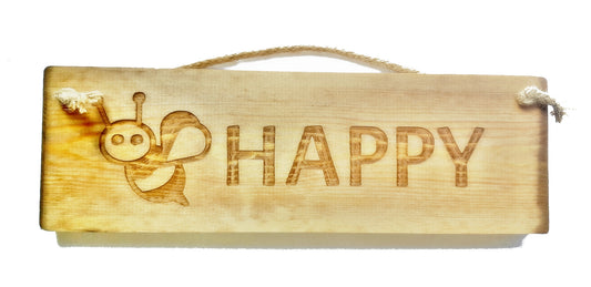 Wooden engraved rustic 30cm Sign Natural "Bee Happy"
