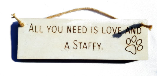 Wooden engraved Rustic 30cm DOG Sign White "All You Need Is Love and a Staffy"