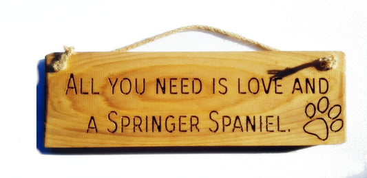 Wooden engraved Rustic 30cm DOG Sign Natural "All You Need Is Love and a Springer Spaniel"