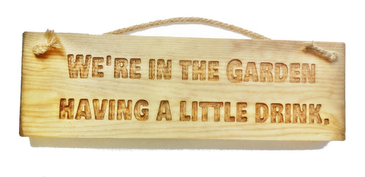Wooden engraved Rustic 30cm Sign Natural "We are in the garden having a little drink"