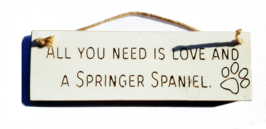Wooden engraved Rustic 30cm DOG Sign White "All You Need Is Love and a Springer Spaniel"