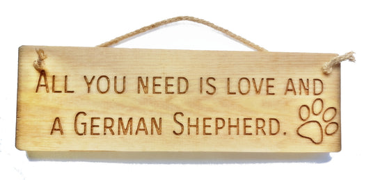 Wooden engraved Rustic 30cm DOG Sign Natural "All You Need Is Love and a German Shepherd"