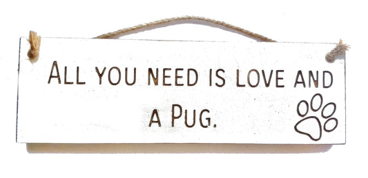 Wooden engraved Rustic 30cm DOG Sign White "All You Need Is Love and a Pug"