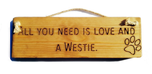 Wooden engraved Rustic 30cm DOG Sign Natural "All You Need Is Love and a Westie"