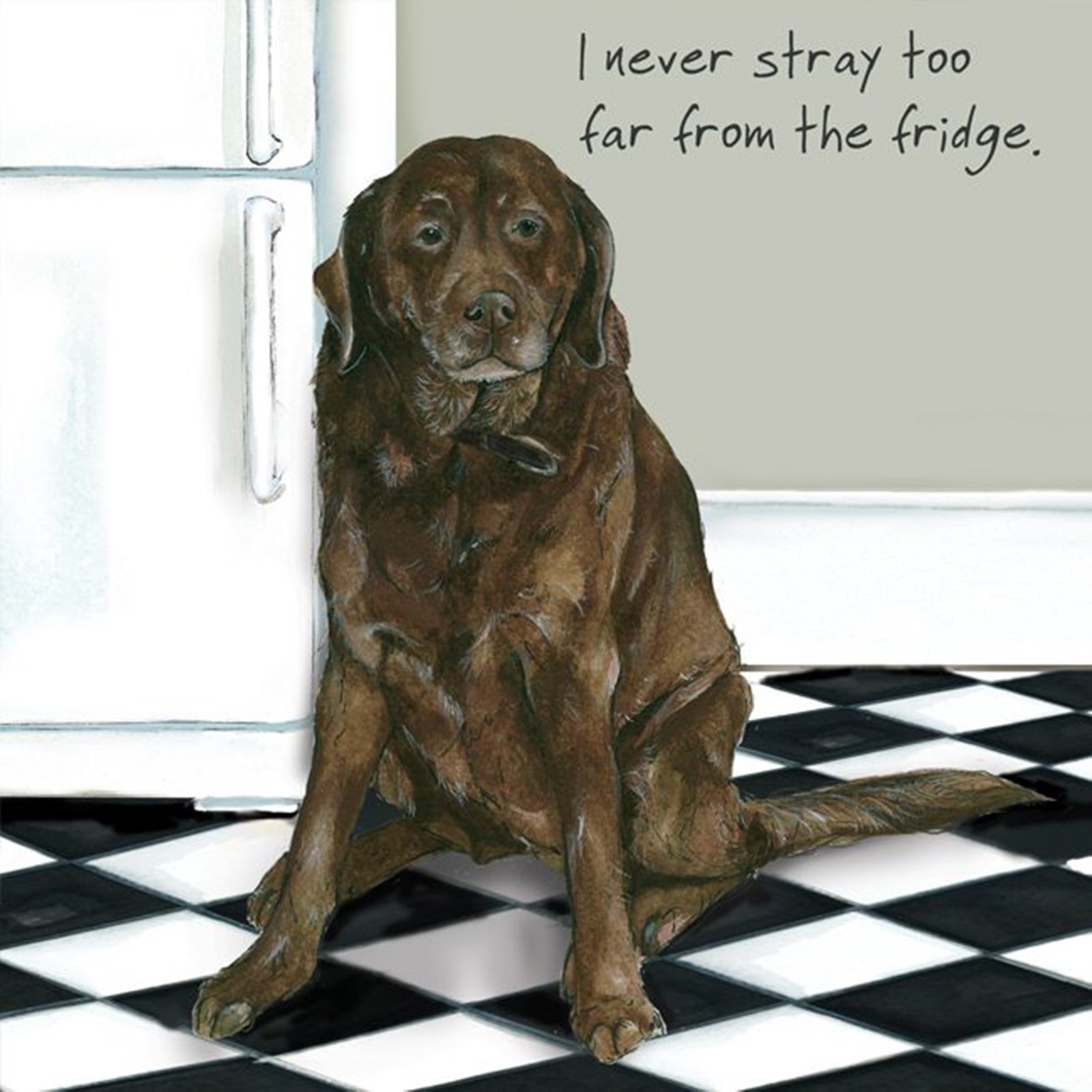 Chocolate Labrador Greeting Card ? Fridge Stray. Grand old lady Bea the Chocolate Labrador is rather famous in our local park. She attends every cricket match including practices and has access to all areas. No lead needed for this lovely girl, she is the personification of calm and gorgeous!