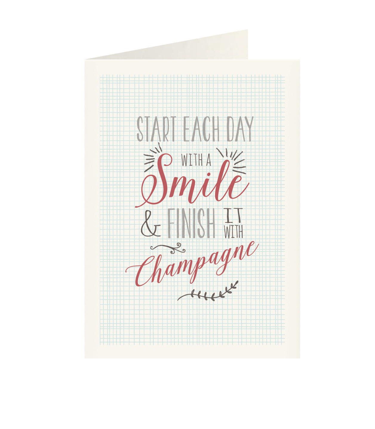 East of India - Just my type greeting card - Start each day with a smile & finish it with champagne