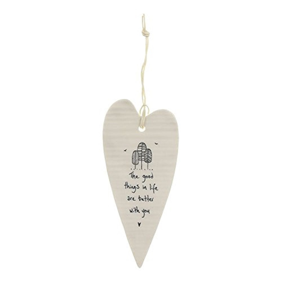 East of India 'The Good Things' Long Porcelain Heart This 'The Good Things' hanging heart decoration makes a stylish and heartfelt gift for a loved one to proudly display in their home. The white porcelain heart features the touching words 'The good things in life are better with you' along with a stylised illustration of a group of trees and two soaring birds engraved on the front. The heart has a gently rippled motif and can be hung anywhere thanks to the string loop at the top of the design. It makes a wonderful gift for friends and family to treasure forever.