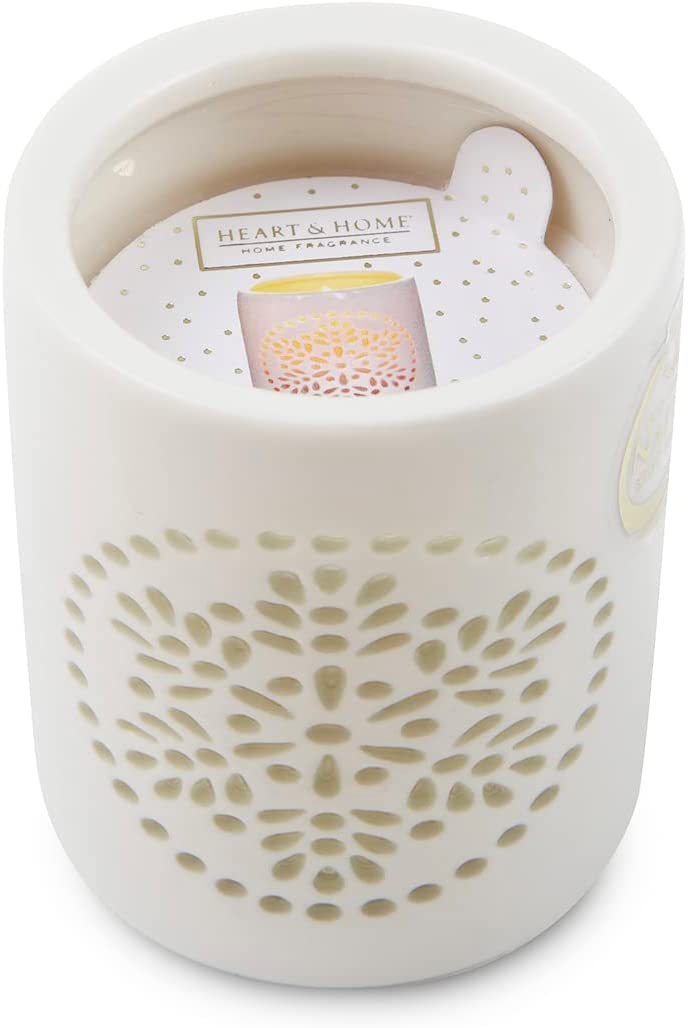 Heart & Home Pureglow Candle - Snow Angel Heart and Home Pureglow candle with radiating light pattern. Up to 30 Hours of burn time with wonderful aroma all the way to the bottom of the jar. Snow Angel is a sublime sweet fragrance with Orange Peel & sweet Patchouli. Essential oils and natural twin cotton wick for a clean burn. White ceramic pot with a delicate cut- out pattern to radiate light when lit. Fragrance-rich signature soy blend wax is renewable, sustainable, and kinder to the environment. The perfect gift idea.