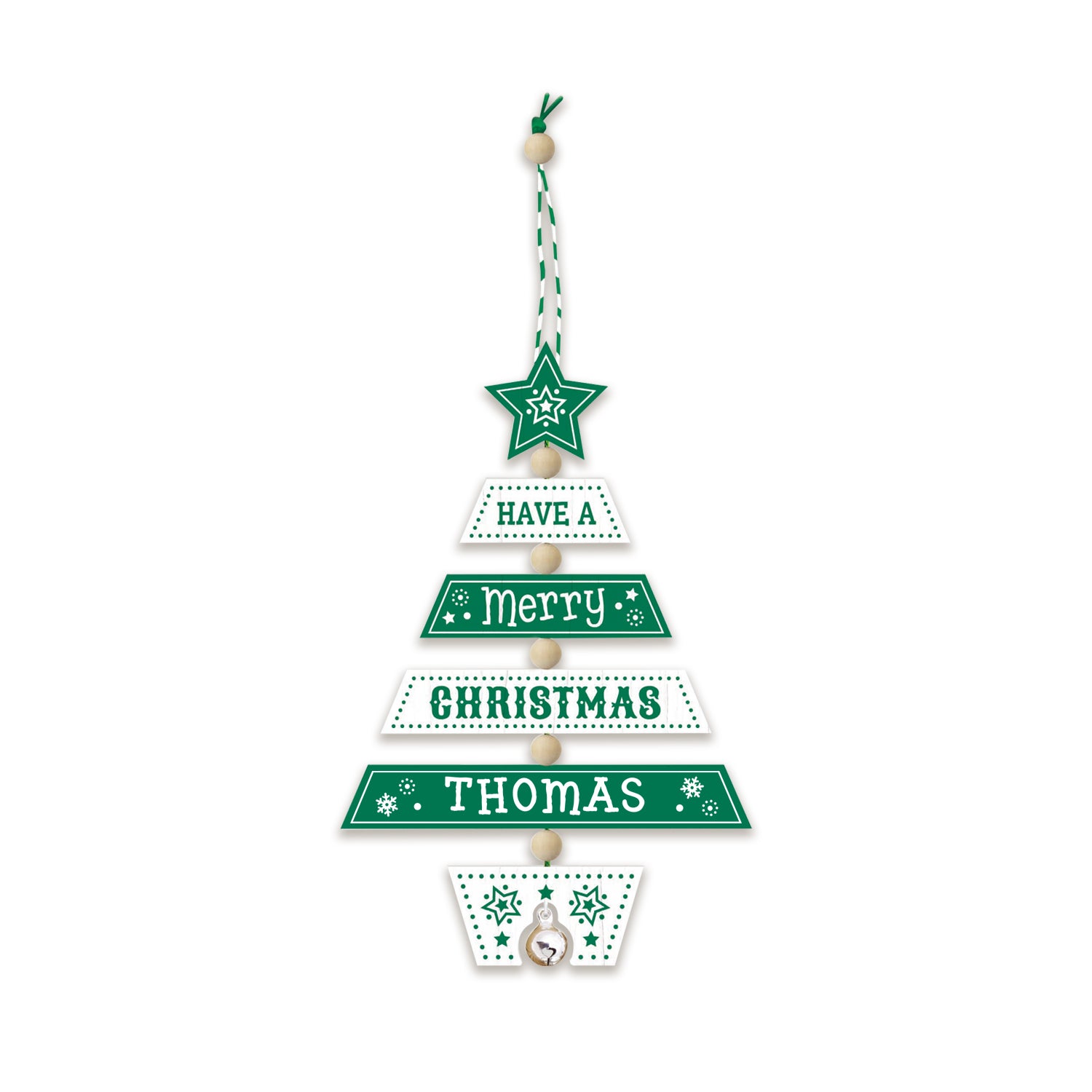 These charming, personalised wooden trees in festive red and green, are strung with beads and topped with a heart or star to complete the perfect picture.