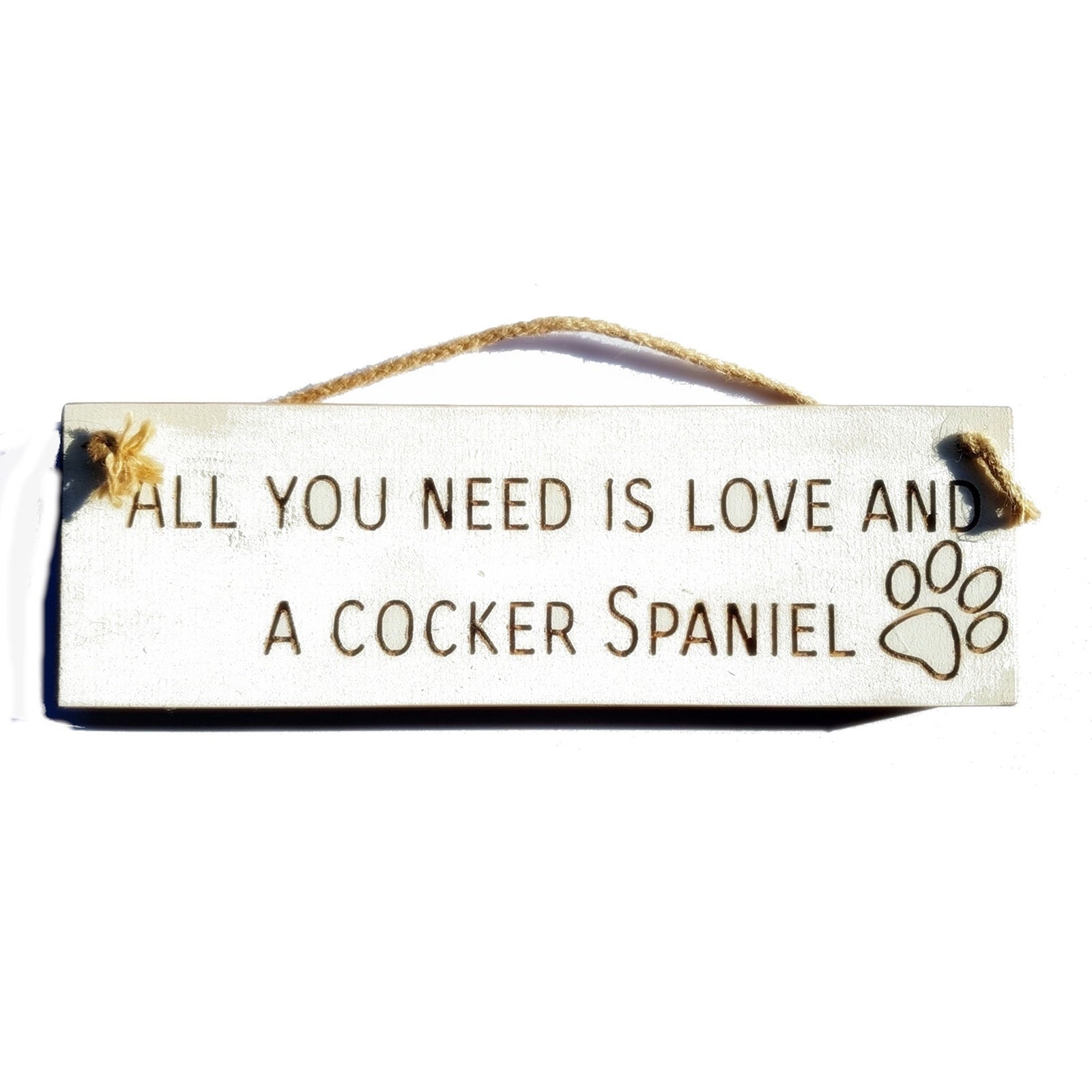 Wooden engraved Rustic 30cm DOG Sign White "All You Need Is Love and a Cocker Spaniel"