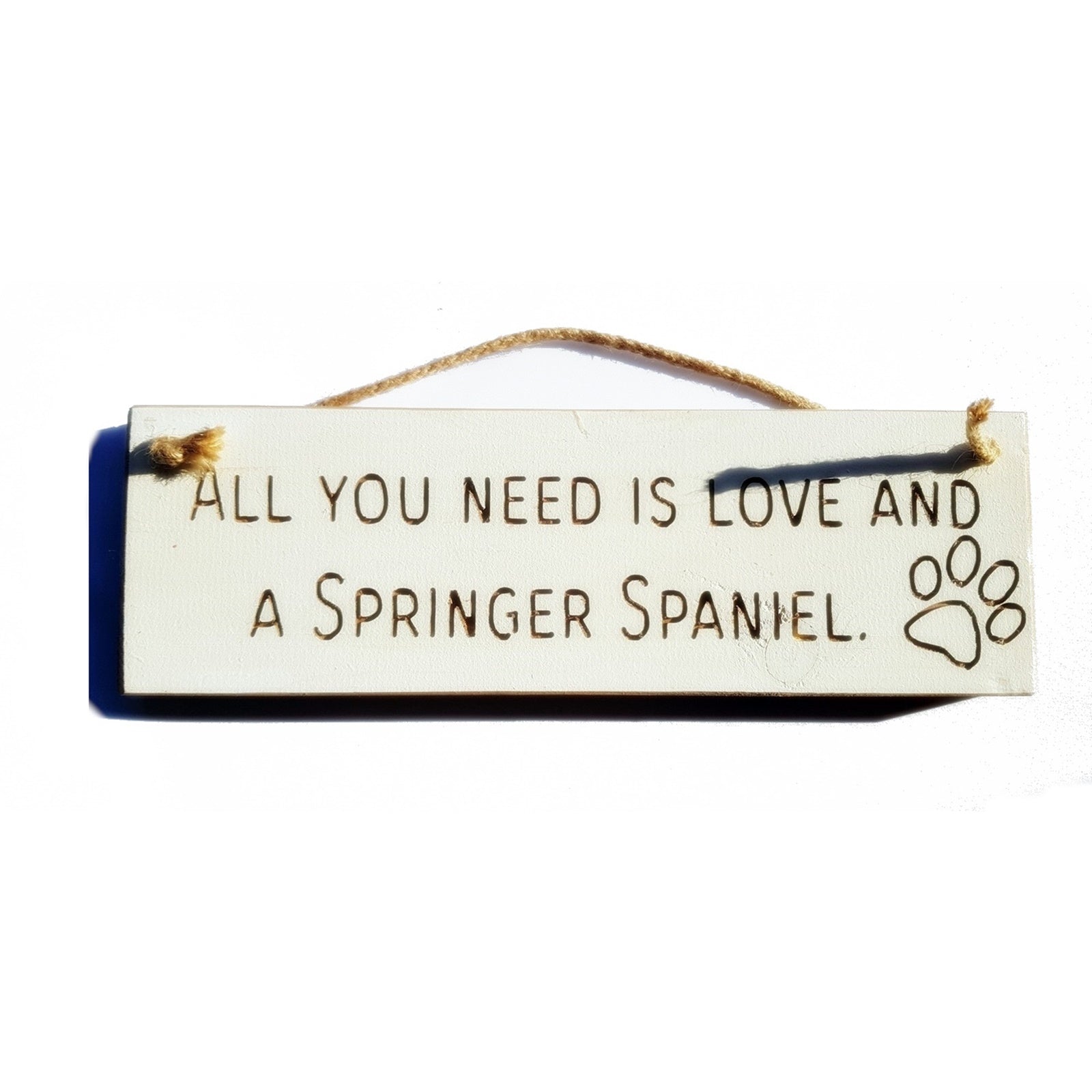 Wooden engraved Rustic 30cm DOG Sign White "All You Need Is Love and a Springer Spaniel"