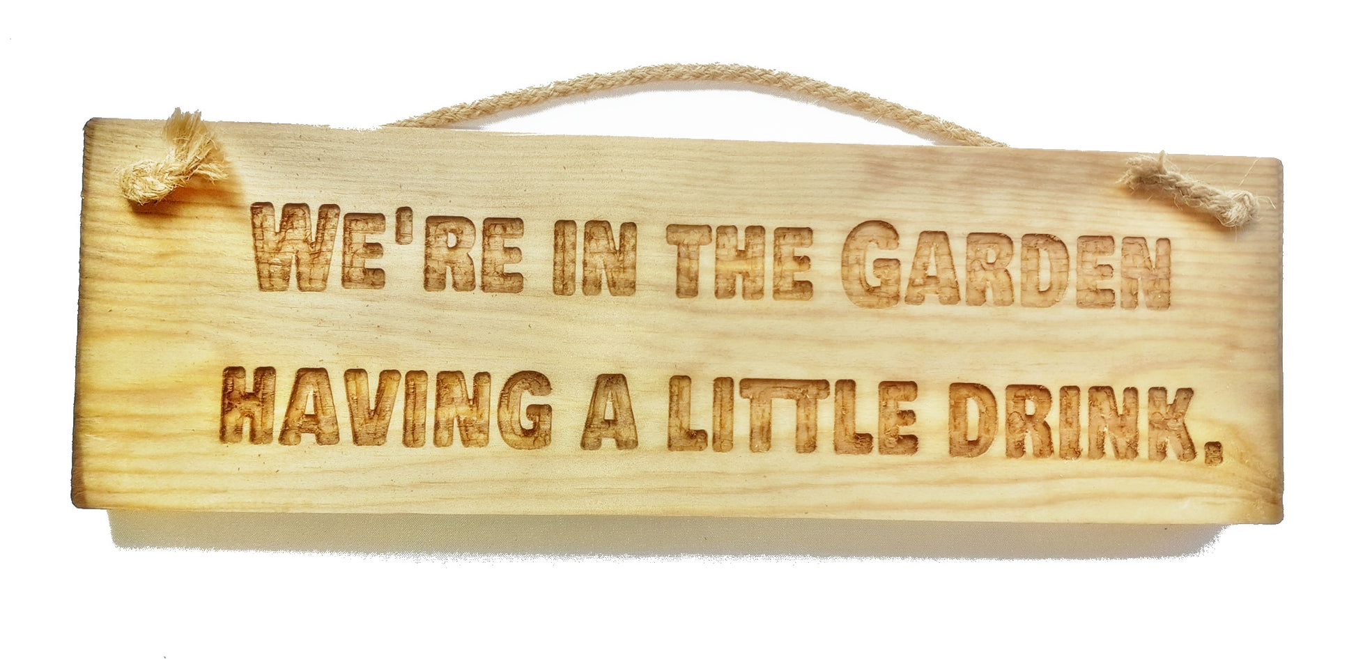 Wooden engraved Rustic 30cm Sign Natural "We are in the garden having a little drink"