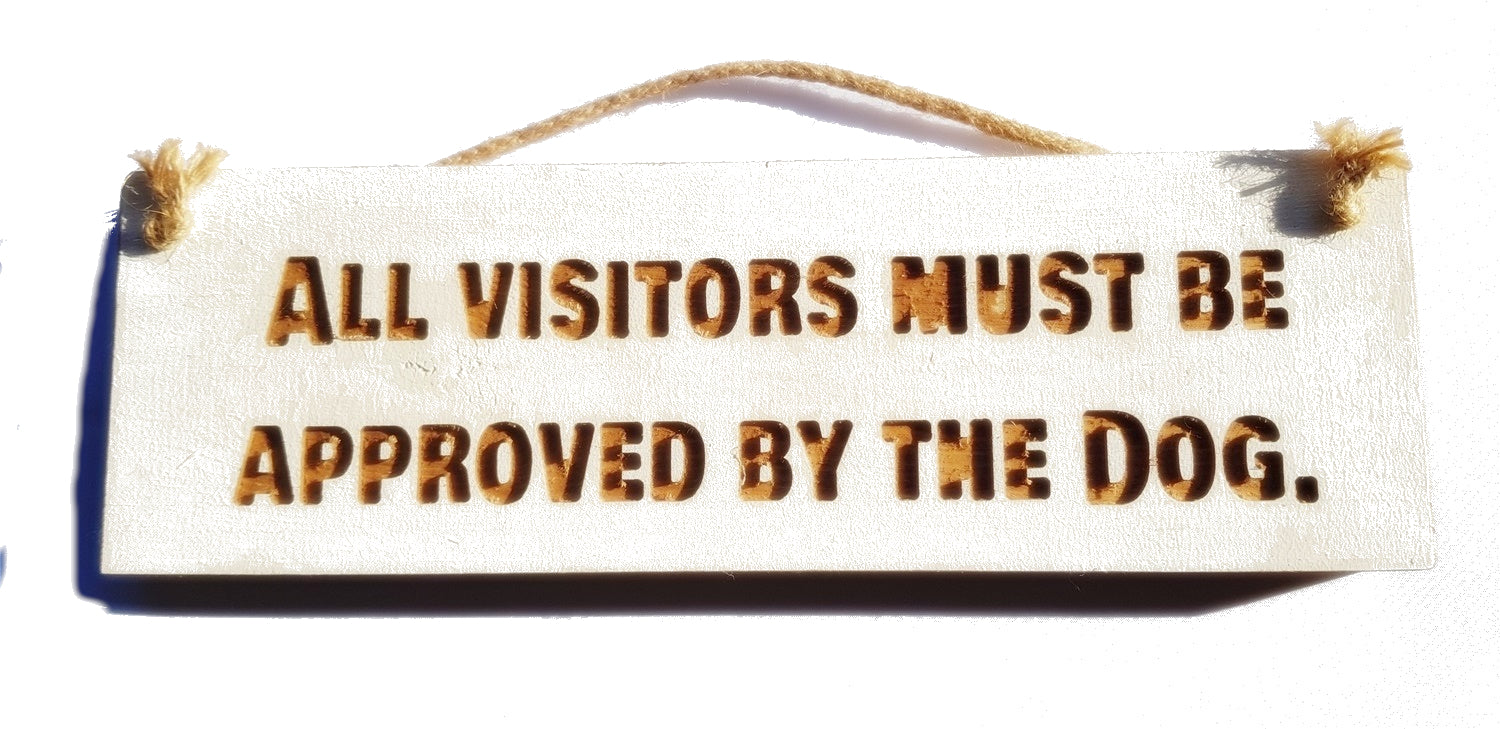Wooden engraved Rustic 30cm Sign White "All visitors must be approved by the dog"