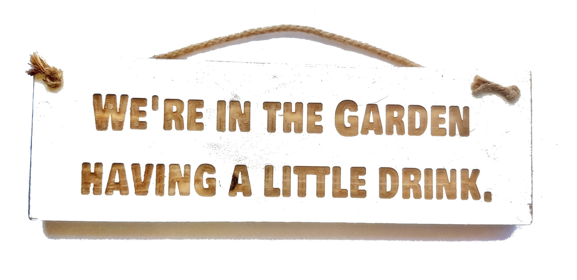 Wooden engraved Rustic 30cm Sign White "We are in the garden having a little drink"
